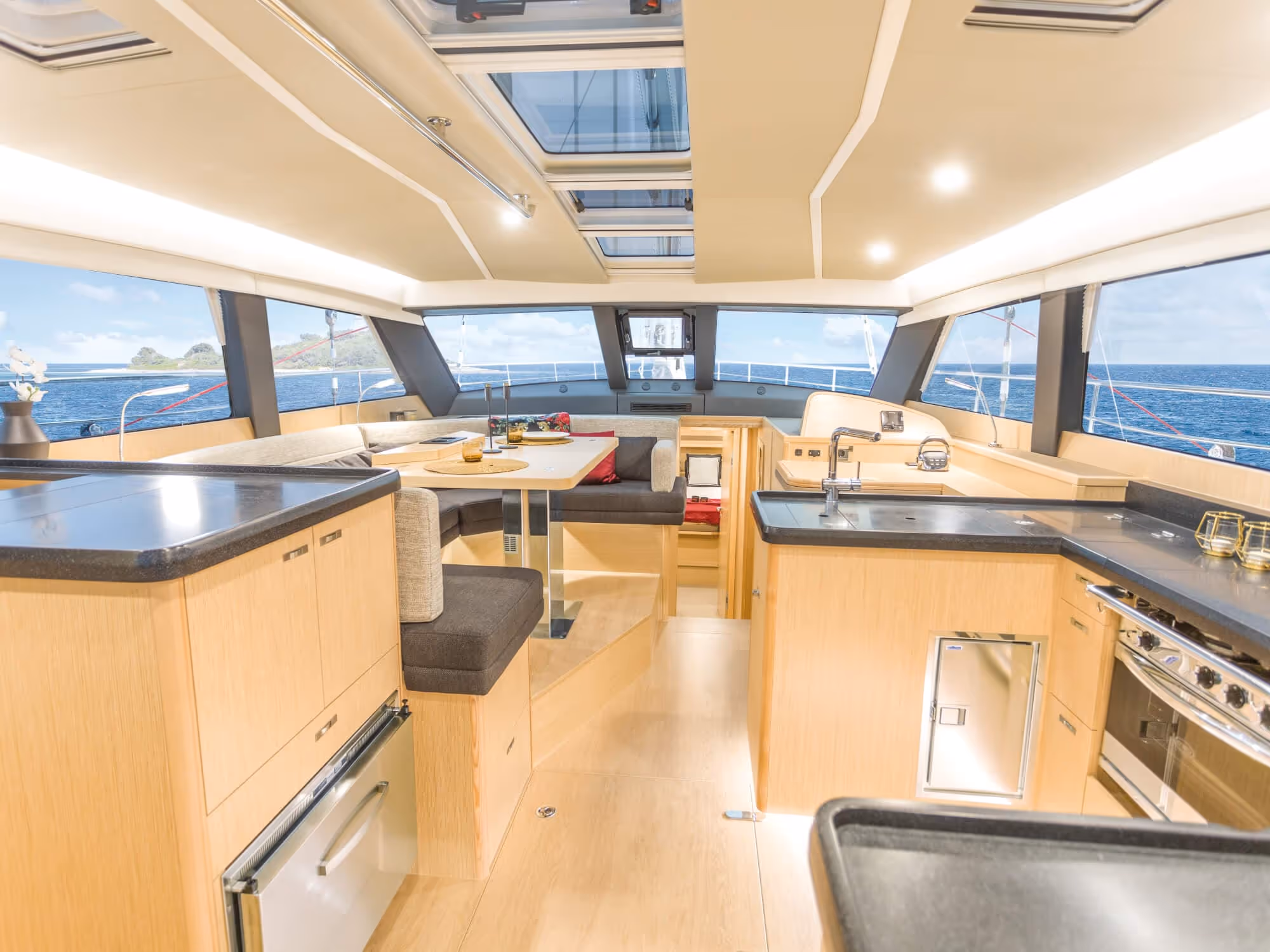 Step inside and you’re greeted by a beautifully appointed interior where natural light floods the saloon through panoramic windows. The layout includes multiple configurations with up to three private cabins and two bathrooms. High-end materials and clean, modern finishes create a refined yet relaxed living space. The central galley and generous dinette make life onboard feel like a home on the water—elegant, functional, and built for true liveaboard comfort.